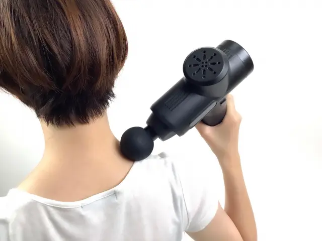 マッサージガンは首そのものに当てるのではなく、肩や背中の上部(僧帽筋)までに留めましょう。特に首の前面や側面は血管・神経が多く危険です。