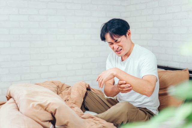 夜間や明け方にしびれが強くなる方は、眠っている間に肘を曲げている可能性があります。長時間の曲げ姿勢は神経を圧迫し続けるため、朝起きたときに症状が悪化していることも珍しくありません。